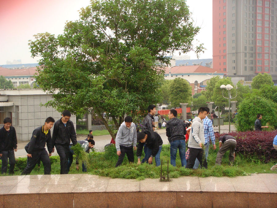 高二(2)班的志愿者们卖力拔除杂草,一切只为更美的校园