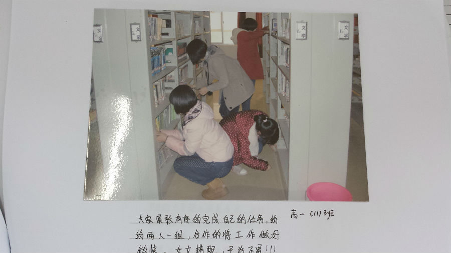高一(11)班的志愿者们打扫图书馆,整理图书