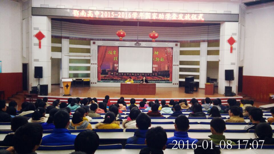 在教育局,财政局和学校的多方通力合作下,我校2015至2016学年秋季学期国家助学金发放工作顺利完成。校团委于1月8号举行了助学金发放仪式。
