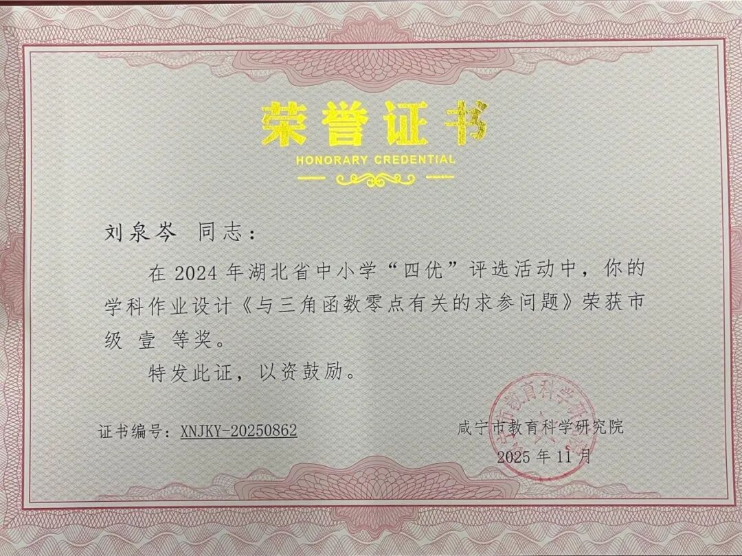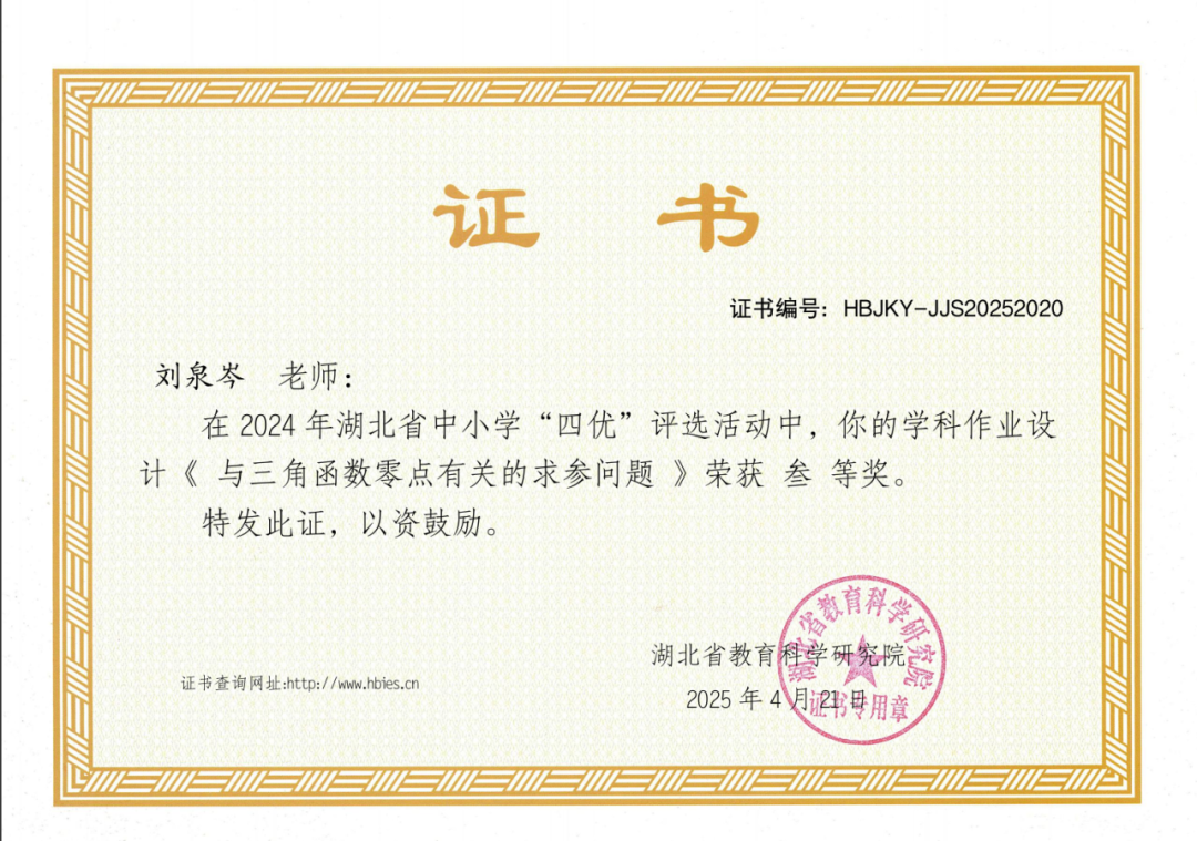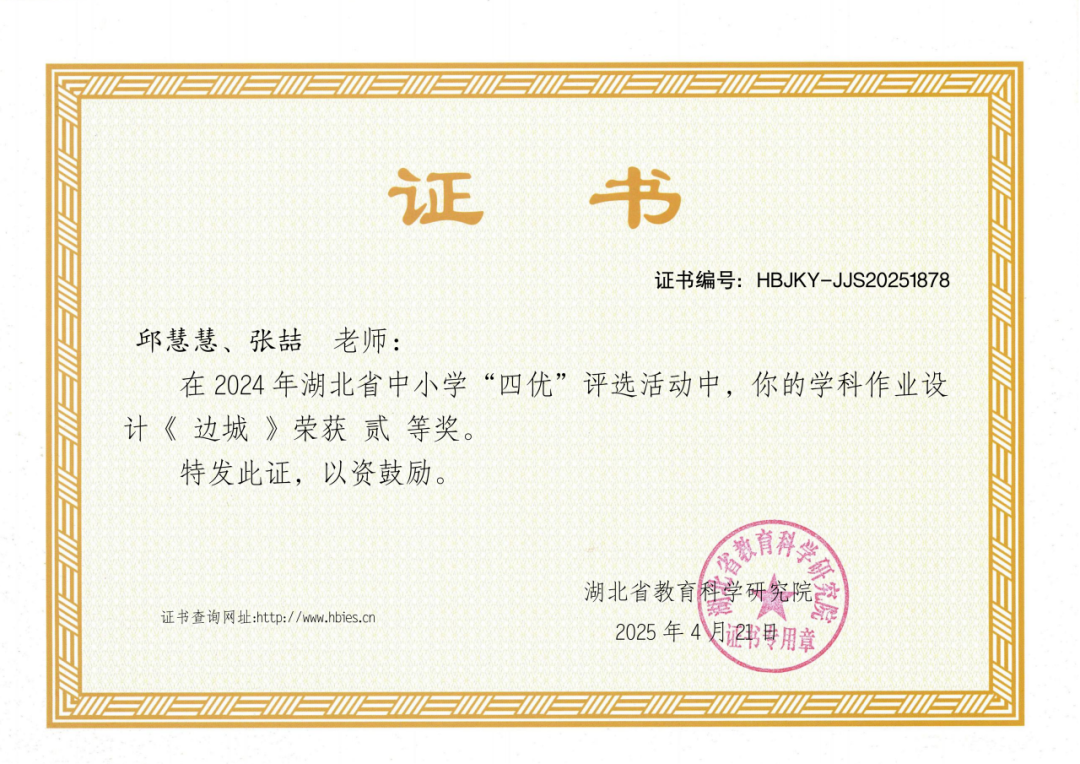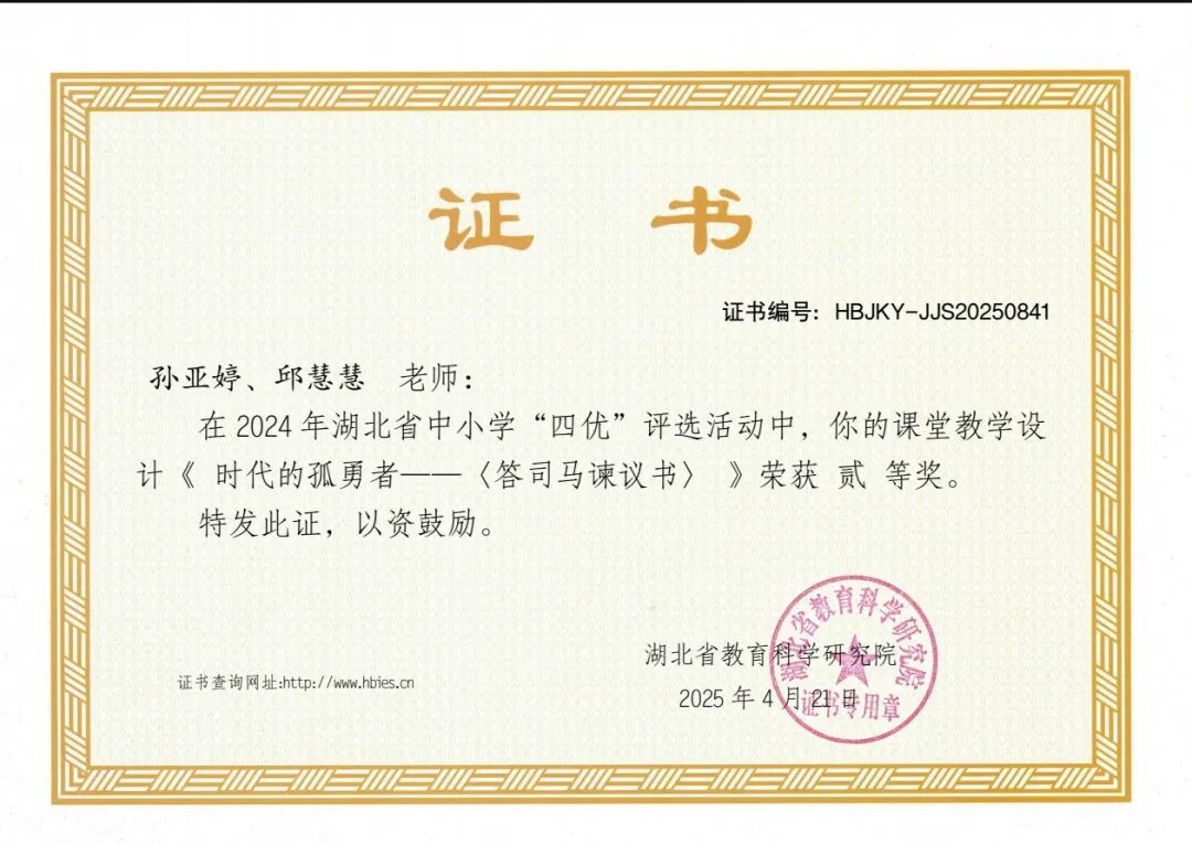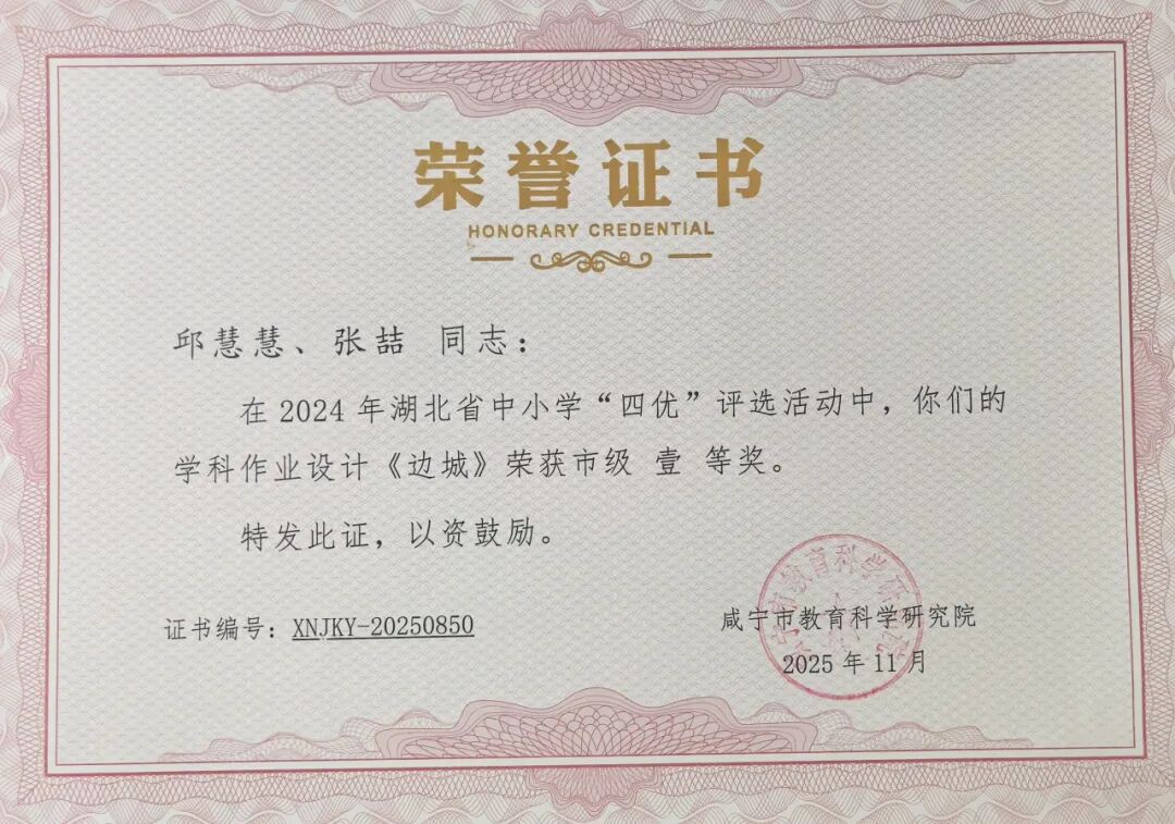 "精品课""四优"评选成果丰硕:生物学科雷雅琪老师的课程获评"湖北省精品课"一等奖。我校教师在"湖北省中小学'四优'评选"中展现出强大实力,语文学科孙亚婷、邱慧慧老师获课堂设计省二等奖,张喆、邱慧慧老师获作业设计市一等奖、省二等奖,数学学科刘泉岑老师获作业设计市一等奖、省三等奖,生物学科林中良老师获作业设计市一等奖,体现了我校教师在落实"双减"、深化教学评价改革方面的深入思考和扎实实践。