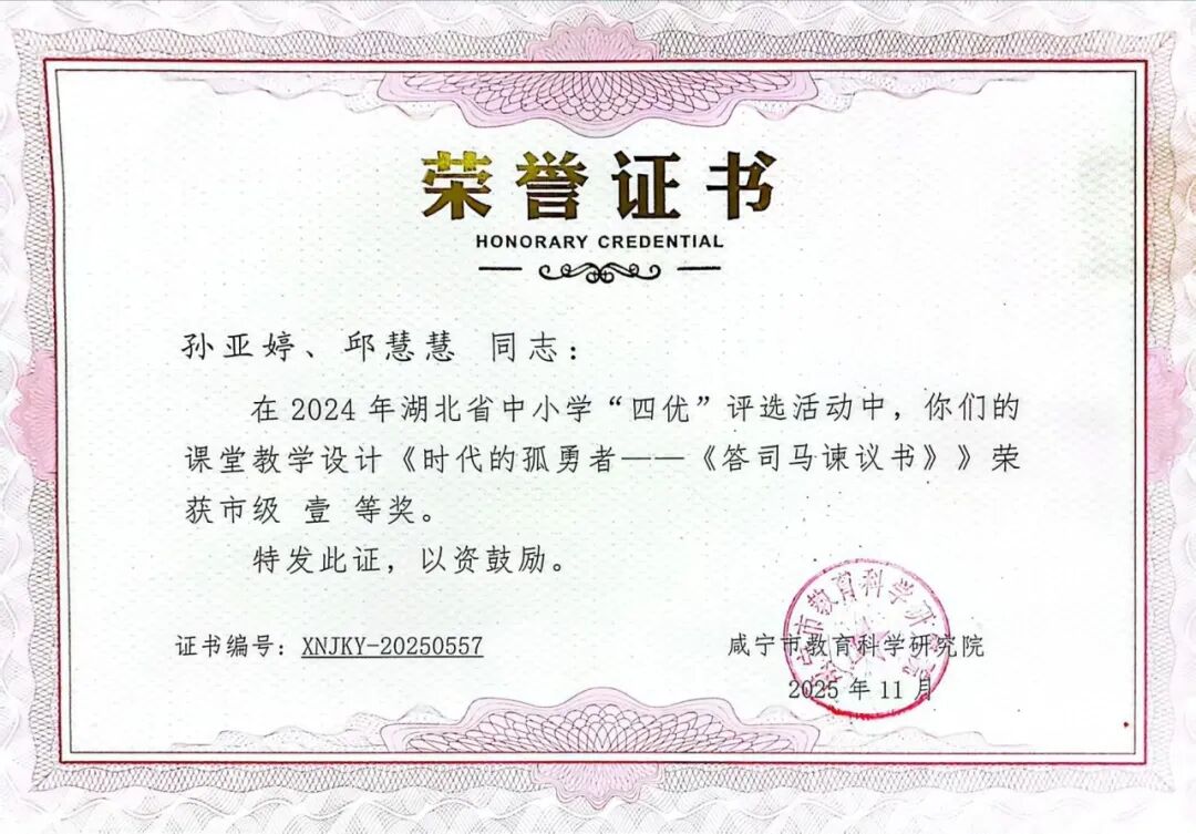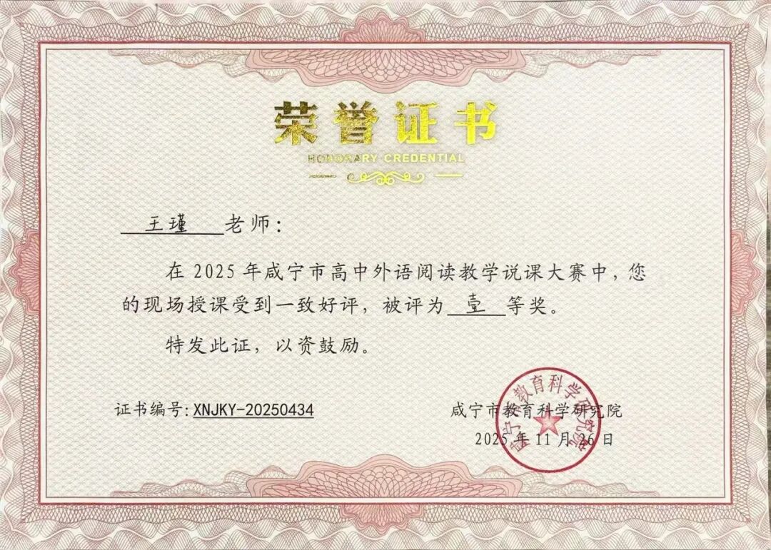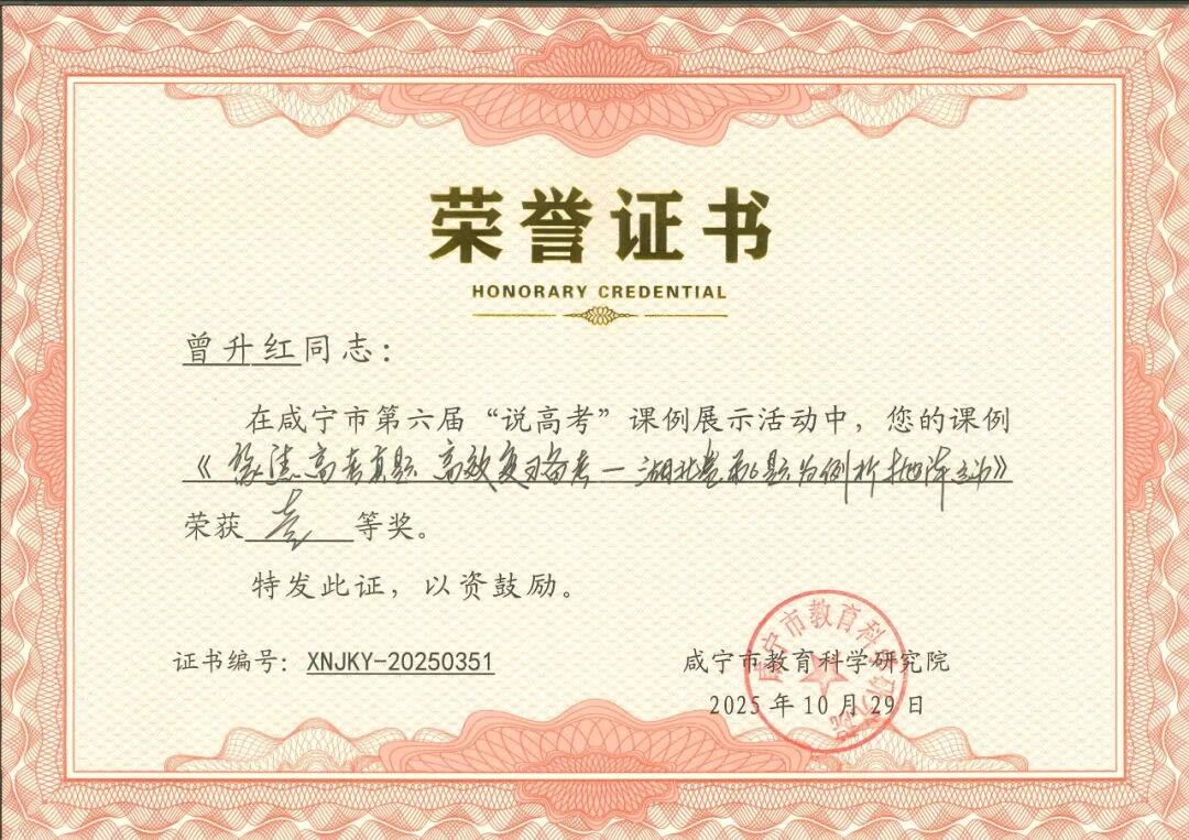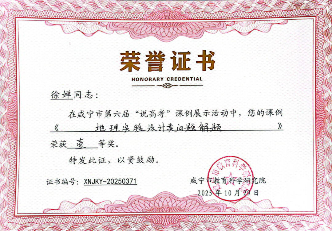 高考研究与教学能力双提升:在聚焦高考改革的"咸宁市第六届说高考"讲课比赛中,物理曾升红老师、政治杨至立老师、地理徐婵老师凭借对高考命题趋势的精准把握和高效的复习备考策略,均荣获市一等奖,彰显了我校教师服务学生发展的专业能力。