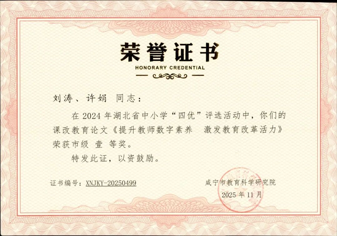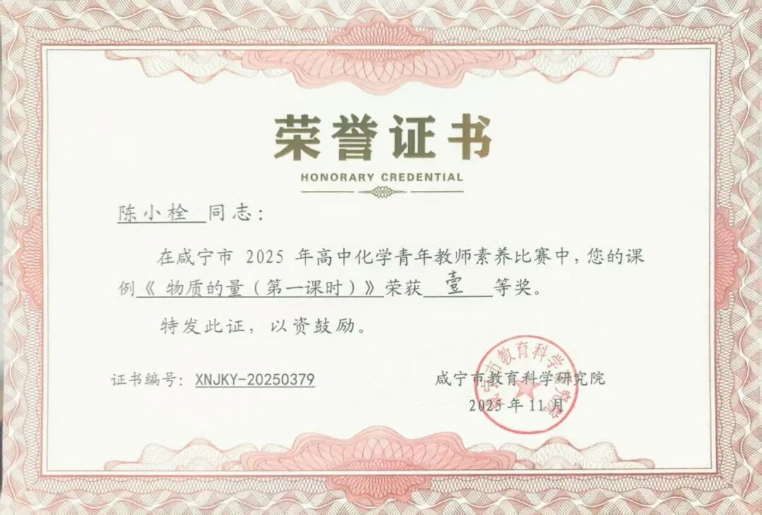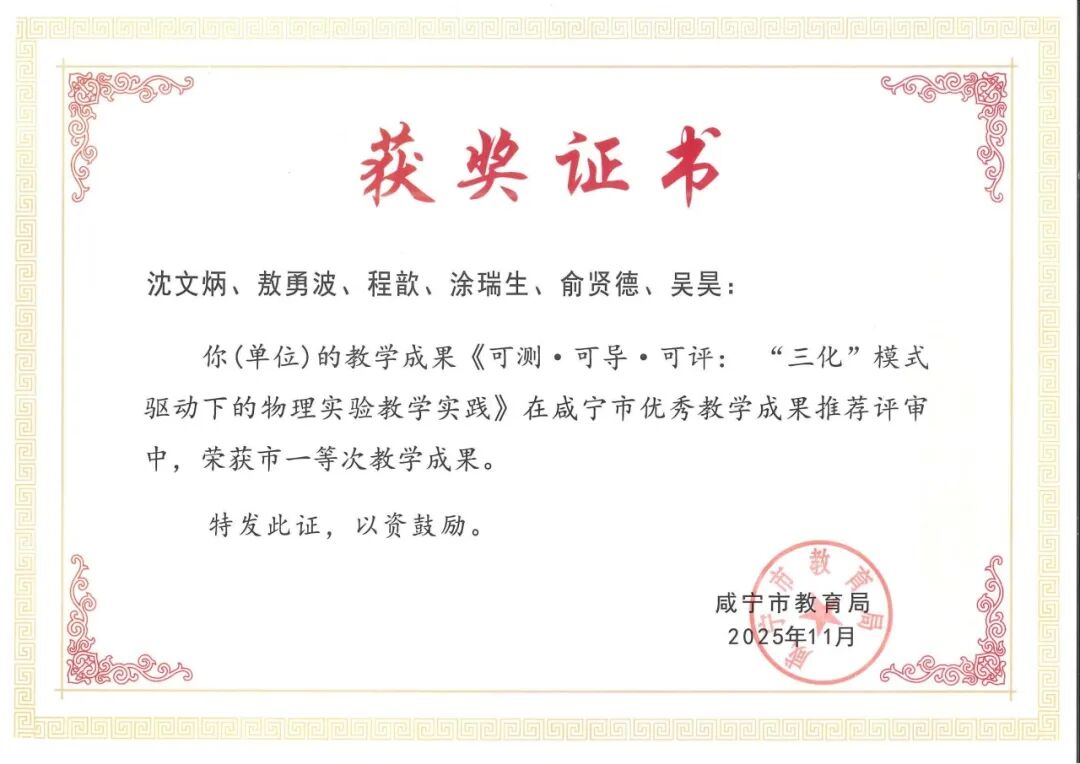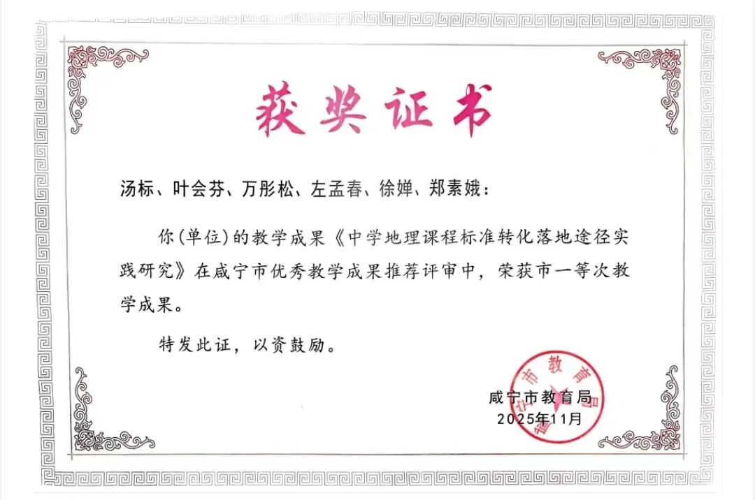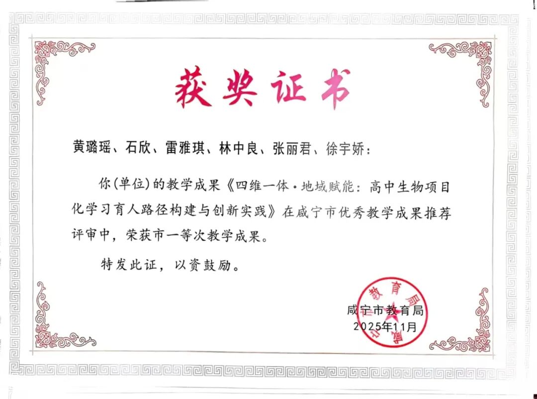 教学成果奖折射科研深度:在"咸宁市教学成果奖"评选中,我校物理(沈文炳等)、地理(叶会芬等)、化学(刘涛等)、生物(黄璐瑶等)等四大学科团队荣获一等奖,并推送省级评选,这些凝结集体智慧的成果,反映了我校在教育科学研究、教学改革探索方面的深厚积淀和持续创新能力。