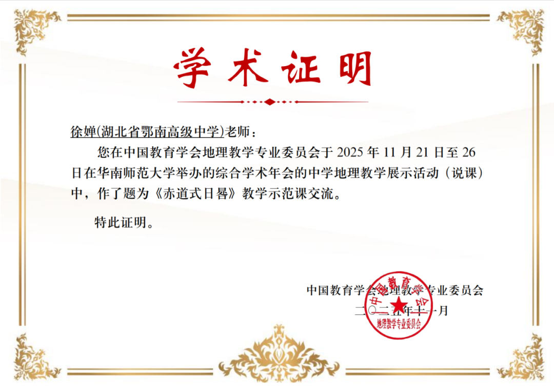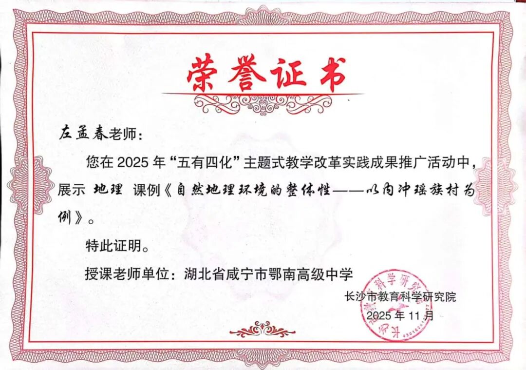 在深耕省市教学基础的同时,我校教师的专业成长步伐也稳健迈向全国舞台。地理学科左孟春老师虽从教仅十年左右,却已凭借丰硕的教学与教研成果,在省内外崭露头角。2025年,她应邀赴湖南参加“五有四化”主题式教学改革实践成果推广活动,执教展示课,其精湛的课堂呈现赢得专家与同行一致赞誉。徐婵老师经层层选拔,代表学校参加“中图版教材全国优质课竞赛”,以优异的教学设计和扎实的课堂驾驭能力夺得特等奖。这不仅是对两位教师专业实力的高度认可,更是“鄂南高中”教学品牌在全国范围内的一次精彩亮相,显著提升了学校的知名度与美誉度。