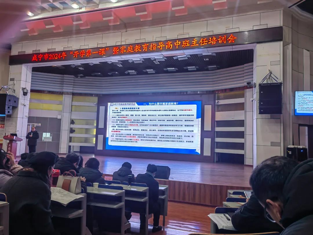 为深入学习贯彻党的二十大精神和 《习近平总书记关于注重家庭家教家风建设的重要论述》,落实《中华人民共和国家庭教育促进法》,进一步健全家、校、社协同育人机制,构建家校社协同育人新格局,提高家庭教育能力,促进家校合作,提升共育品质,更好地促进学生成长,2024年3月1日,咸宁市2024年“开学第一课”暨家庭教育指导高中班主任培训会在我校学术报告厅举行。报告会由咸宁市委文明办、市教育局、团市委、市妇联联合举办,湖北省鄂南高级中学、咸宁市家庭教育研究会承办。鄂南高中、温泉高中、东方外校、咸宁高中、青龙山高中、横沟高中、鲁迅学校分管德育副校长,德育主任和高一、高二年级全体班主任参加报告会。报告会由鄂南高中学生发展处主任华绪柱主持。