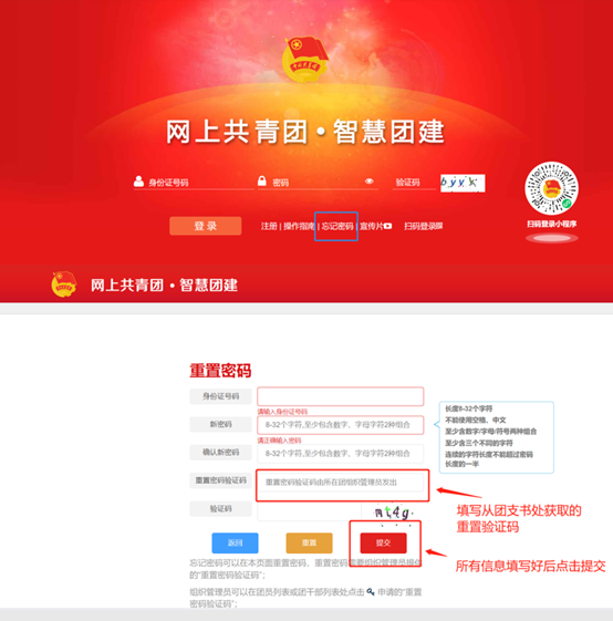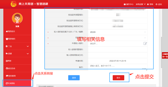 2. 大学入学后:确认自己所在团支部名称,登陆智慧团建,填写并提交组织关系转接申请,等待审核通过。若遗忘登陆密码,请联系毕业所在班级团支书重置并修改密码。