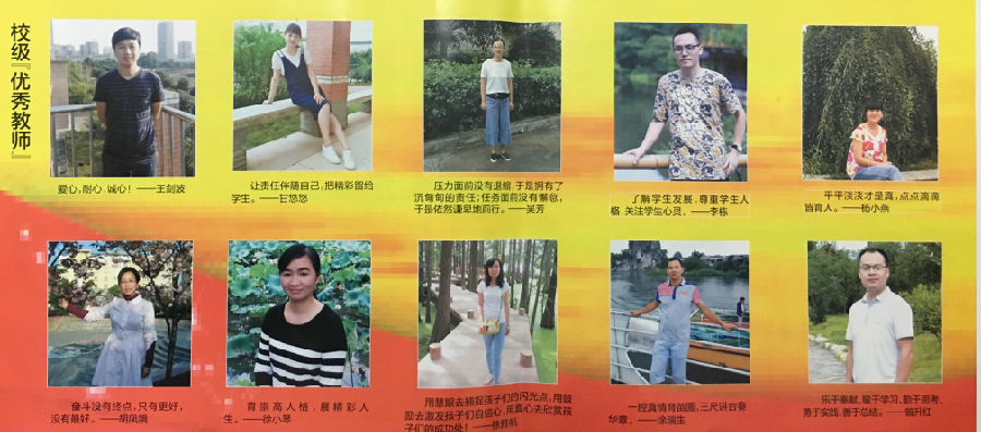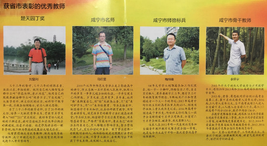 编者按:站三尺讲台,教孩子三年,为孩子想三十年。值第三十二个教师节来临之际,我校表彰了一批优秀教师。他们在践行“两学一做”“履职尽责”过程中孜孜以求,勇立潮头,奏响了一曲昂扬奋进的杏坛之歌。谋利当谋天下利,求名应求万世名;三尺讲台大世界,传道授业点滴中。希望全体老师向他们学习,再立新功,再创新高,为把我校建成荆楚一流名校而顽强奋斗!