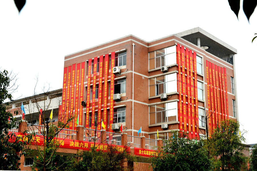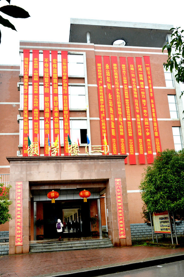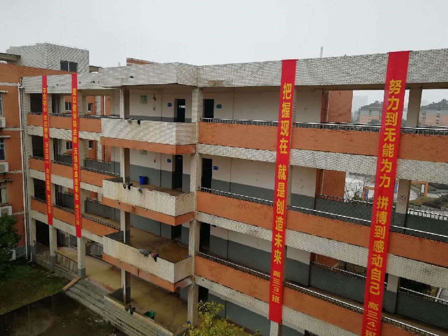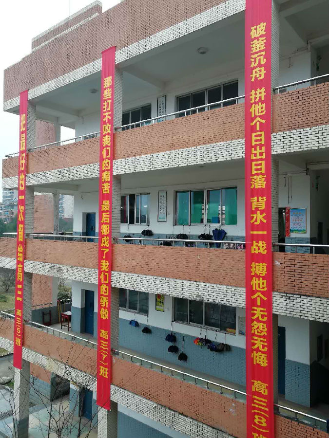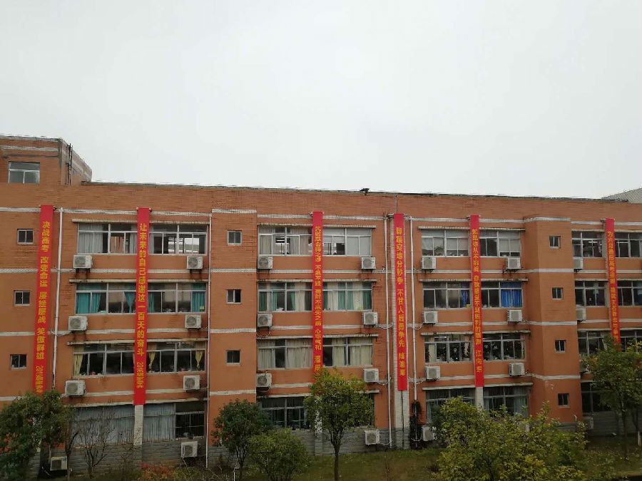 教学楼群,满满的祝福和励志语,迎风飘扬的彩旗,将伴随着孩子们渡过人生中最关键的时期,时刻激励着孩子们,不忘初心、牢记使命,负重前行,万念归一,全力冲刺,众志成城,誓夺取2019年高考的全面胜利!