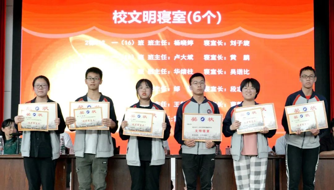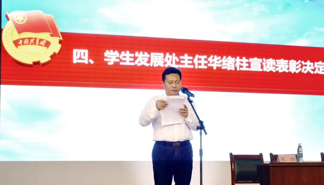 学生发展处主任华绪柱宣读关于表彰2021-2022学年度文明班级、文明寝室、优秀学生干部、优秀学生、优秀寝室长的决定