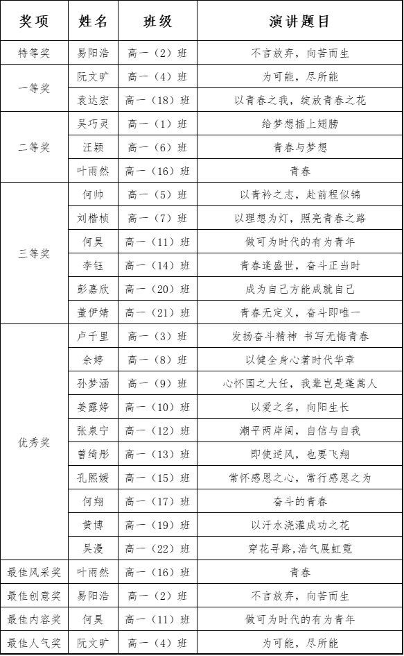 本次演讲比赛在年级主任吕骥宣读比赛要求、评分标准及奖项设置后正式拉开了序幕。来自高一年级各个班级的22位选手,以饱满的热情、真挚的语言、感人的事例或抒发对青春的独到见解,16班的叶雨然同学提到“青春是丛林,是荒原,是阳光炙热的奔跑,是大雨滂沱的伫立,青春更是一种宣言,它昭示着自古英雄出少年的激情”;或畅谈梦想于青春的意义, 21班的董伊婧同学这样说道“一个清晰的目标理想,是我们对学业成就的一种追求和希望,是一种勇敢生活的积极态度,更是我们对生命的一种思考”;或诠释奋斗于青春的重要性, 14班的李钰同学讲到“星辰和大海是要门票的,诗和远方的路费也很贵,而青春没有定义,奋斗即是唯一,青春因磨砺而出彩,人生因奋斗而升华;还有一些选手或谈到怀有感恩之心,用责任感回报青春岁月里引领我们前进的父母、老师,或谈到以健全的身心谱写青春篇章,又或谈到以自信的微笑坦然面对可爱的青春。尤其是最后一位选手来自2班的易阳浩同学以《不言放弃,向苦而生》为主题,号召同学们“苦是人生的一堂必修课,时代的考题已经列出,一代人有一代人的长征,鄂高人要始终不言放弃,向苦而生”,真挚激昂的语言深深感染了在场的嘉宾、评委和师生们,把现场气氛一次又一次推向高潮,为本次演讲活动画上了完美的句号。