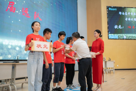 袁慎彬校长亲点“状元”,并为荣获“状元”的届远队戴上大红官帽,颁发证书和奖品;高二年级分管校长李志为荣获“榜眼”称号的木兰队颁发证书和奖品;副县级调研员李德胜为荣获“探花”称号的青遂队和苍逸队颁奖证书和奖品;高二年级主任孔松林为荣获“进士”称号的北冥队、无为队和争流队颁发证书和奖品。