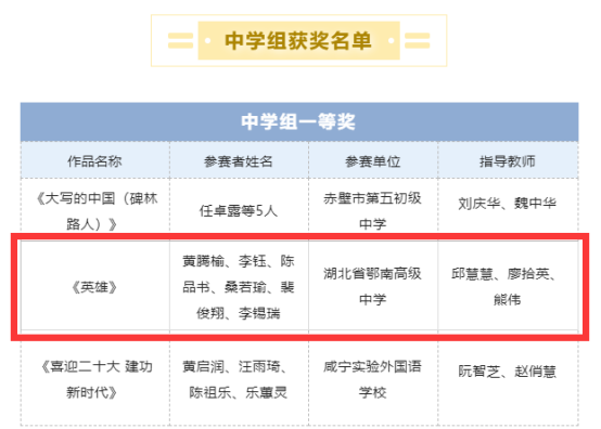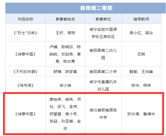 在参赛师生的共同努力下,鄂南高中提交的两件参赛作品,经过层层比拼,最终学生朗诵作品《英雄》获中学组一等奖,教师朗诵作品《诗意中国》获教师组二等奖。