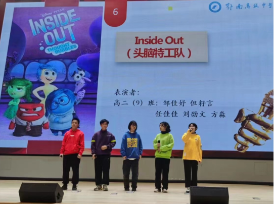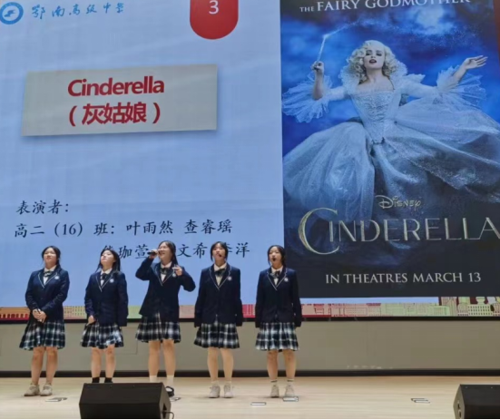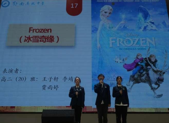大赛在一段青春洋溢的热舞中拉开帷幕,比赛精彩纷呈、高潮迭起。高二(4)班同学将《Storks》片段模仿得惟妙惟肖;高二(16)班同学演绎的Cinderlla角色个性突出,对比鲜明;高二(1)班Little Woman配音团队深情款款与角色浑然一体;高二(8)班、高二(13)班的作品治愈心灵,催人上进;高二(9)班、高二(20)班同学歌声悠扬,独具魅力。中场节目Guessing game更是点燃了观众的激情,同学们开动脑筋,认真思考,积极发言,台下掌声迭起。
