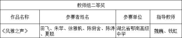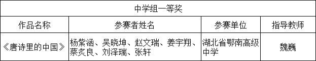 为引领社会大众亲近中华经典,传承弘扬中华优秀文化,根据湖北省教育厅办公室《关于在全省组织开展第五届中华经典诵写讲大赛的通知》文件精神,咸宁市教育局在全市教育系统组织开展了第五届“诵读中国”经典诵读大赛。鄂南高中师生积极报名参赛,两部参赛作品分别获得中学组一等奖、教师组二等奖。