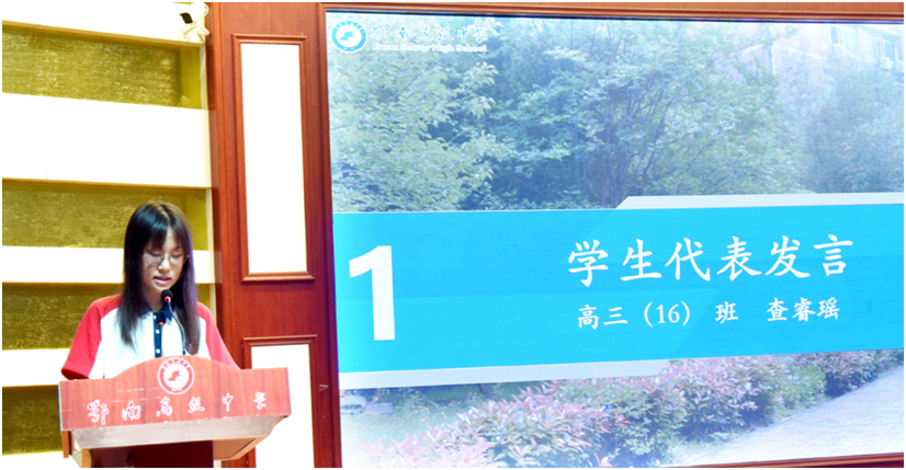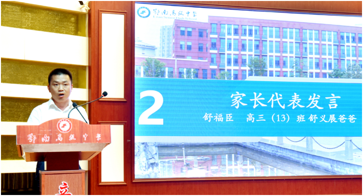 家长代表舒福臣通过“感谢”、“惭愧”和“期待”三个关键词表达了家长们的心声。感谢孩子的努力;感谢辛勤耕耘的师长;感谢袁校长领导的这个优秀的教师管理团队。遗憾自己在“家校合作”方面做的还不够。期待孩子们在老师的培养下得到全面发展,成就自我,在明年的高考中取得辉煌。