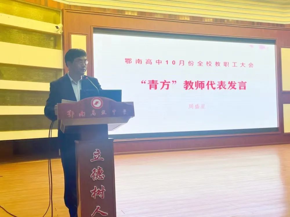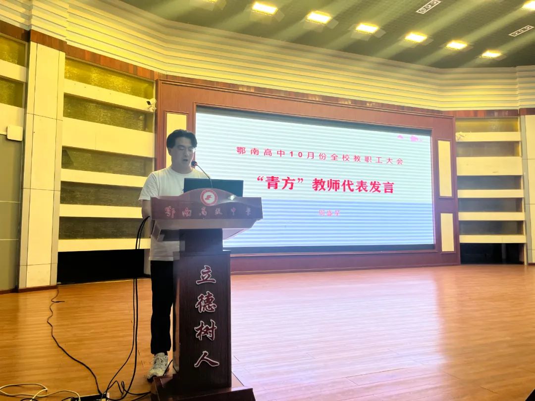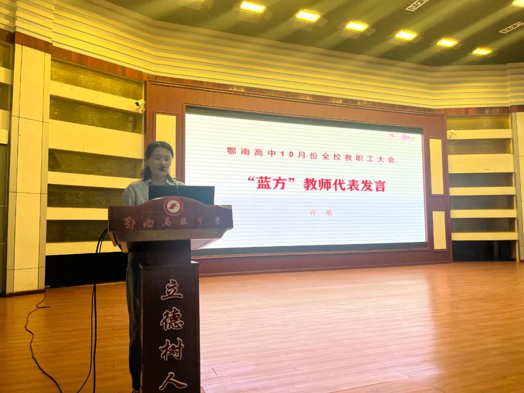 指导教师许娟作为蓝方代表发言。她表示,感恩学校的栽培与信任。作为师傅,会将自己的经验毫无保留地传授给徒弟们,主动工作、积极引领,在新教师遇到困难时给于真诚的关心和帮助,互帮互助,共同进步。 近年来,我校高度重视教师队伍建设,积极搭建教师学习交流平台,创新教师成长机制,成立“学术委员会”“青年读书会”等学术机构,开展“教师论坛”“鄂南高中大讲堂”等品牌活动,积极开展课题研究、组建“名师工作室”、研发校本课程,增强教师队伍建设的动力与活力,“青蓝工程”的实施是我校教师队伍建设又一有效举措。