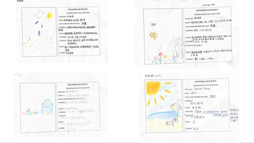 建立健全心理安全预警机制,各班配备两名心理委员(男、女生各一),寝室配备联络员,各年级配备10-15名左右心灵守护师,构建学校——年级——班级——寝室四位一体的心理安全网络体系,做到早预防、早发现、早报告。我校在高一年级开设心理健康课,选用周宗奎主编的《心理健康教育》作为参考教材,根据中学生心理发展特点和规律,融知识性与趣味性为一体,结合教材主题,设计心理健康教育系列课程。(1)近年来,我校高度重视心理课的开展,我们也坚持将知识融入活动,组织了形式多样、丰富多彩的心理课,如情绪管理、人际关系、压力释放等课程,让学生们在轻松的氛围中学到实用的心理知识。(2)与此同时,我们每学期还会开展1-2节特色活动课,让同学们可以在活动中感悟,在体验中成长,比如“烦恼药丸”、“心情树洞”等活动。同学们可以充分发挥自己的想象力和创造力,发明一种解忧药丸,来帮助大家解除忧虑,收获好心情。(3)针对每堂心理课的不同主题,每学期学生需小组合作从中选择一个主题完成心理主题手抄报,我们会将其中的优秀作品以及课堂创作的优秀作品在心理长廊上墙展示,从而更好地激发学生学习心理健康知识的主动性和积极性。(4)除此之外,我们每年还会根据学生的共性问题开设校本课程,目前已开展网络成瘾、压力应对两期心理主题校本课程。