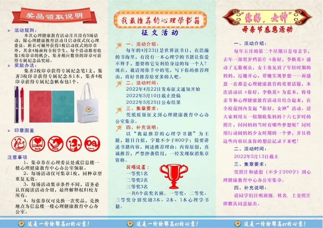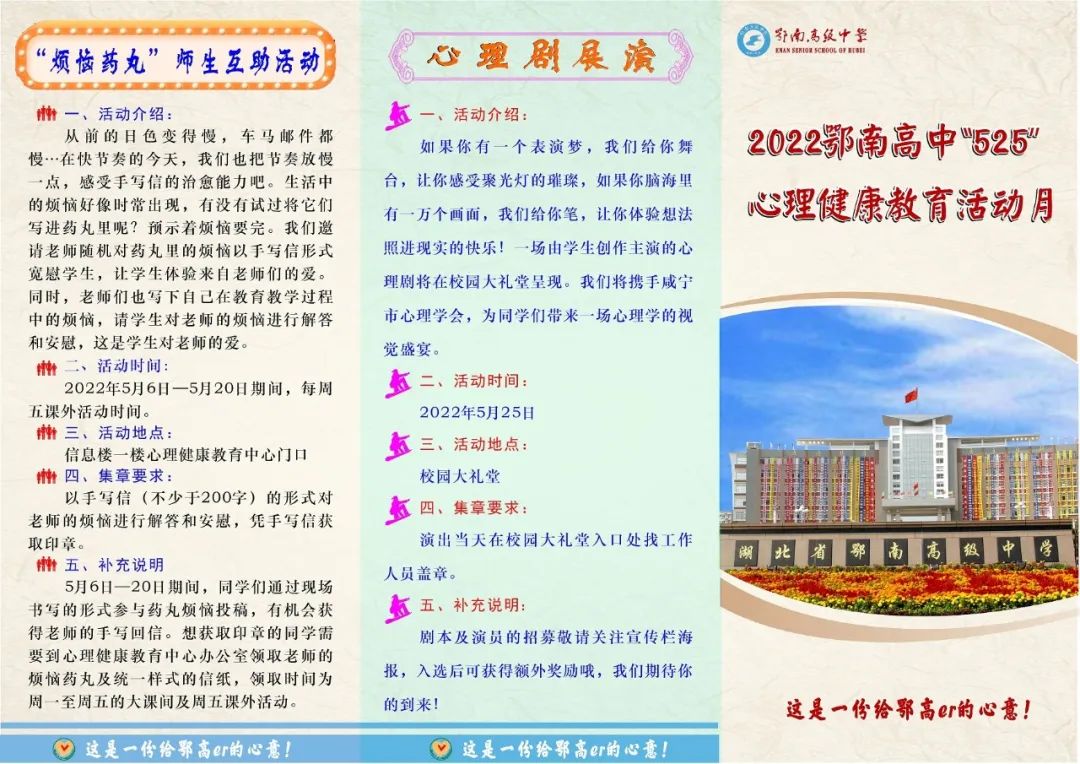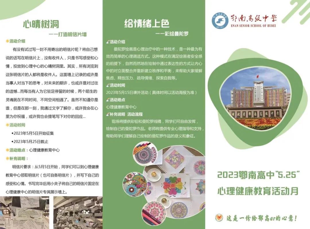 2004年团中央学校部、全国学联共同决定将每年的5月25日定为全国大、中学生(包括中职学生)心理健康日,取义“5·25”的谐音——“我爱我”,提醒大、中学生“珍惜生命,关爱自己”。我校自2022年起连续举办了两届心理健康活动月,邀请全校师生共同参与,通过为期一个月的各项活动,以多种形式在校园内宣传心理健康知识。2022年4月26日下午,我校在学术报告厅举行了鄂南高中第一届心理健康教育活动月启动仪式,选定首届心理委员,创立了我校心理社团——心熠社,袁慎彬校长为心熠社授牌。第一届心理健康教育活动月共设有启动仪式、“我最推荐的心理学书籍”征文活动、“你好,女神”母亲节感恩活动、“烦恼药丸”师生互助活动和心理剧展演共5场心理主题活动,面向全校学生。