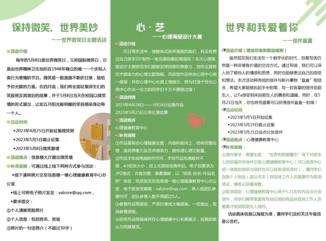 2023年5月我校开展了鄂南高中第二届“5·25”心理健康教育活动月系列活动。此次心理健康活动月以“阳光‘心’行动,健康向未来”为主题,分别围绕“心展示”、“心交流”、“心体验”、“心宣讲”四个方面,开展了世界微笑日主题活动、心理海报设计大赛、信件盲盒、打造明信片墙 、彩绘曼陀罗等子活动。据学生反馈说“感觉活动月趣味性较强,同学们的参与度很高,吸引了很多的同学走进心理中心。参加这些活动让我感到很开心很放松。”我校希望通过活动月的系列活动,将心理健康教育中心打造成为鄂南高中有温度、有特色的一角,成为同学们尽情表达自我,获取心理能量的地方,与此同时,也能增强同学们对自身心理健康和心灵成长的关注,从“心”出发,用阳光心态助力每一位鄂高学子的健康成长和全面发展。