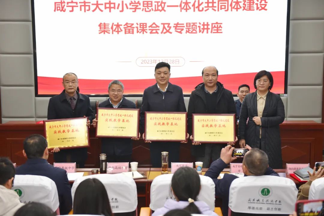种树培根,育人育心。思政课是立德树人、培根铸魂的关键课程。为深入贯彻落实党的二十大精神,全面落实习近平总书记在全国教育大会和学校思想政治理论课教师座谈会上的重要讲话精神;努力提升我市思政课教师教育教学水平,全面落实立德树人根本任务,统筹推进大中小学思政课一体化共同体建设,推动思政课建设内涵发展,2023年12月28日,咸宁市大中小学思政一体化共同体建设集体备课会及专题讲座活动在咸宁职业技术学院举行。来自湖北科技学院、咸宁职业技术学院、咸宁职业教育(集团)学校、鄂南高中、咸宁高中、温泉中学、咸宁市实验小学等12所学校共同体单位的书记或校长、思政课负责人及思政课教师代表共聚一堂,围绕习近平文化思想这一主题,通过集体备课、专家学术报告等形式,进行了深入探讨,共绘思政育人同心圆,共写立德树人大文章。