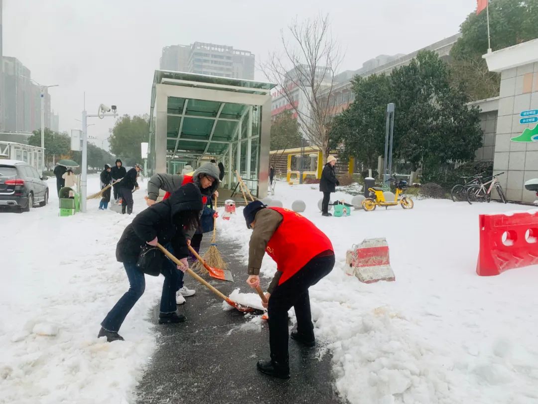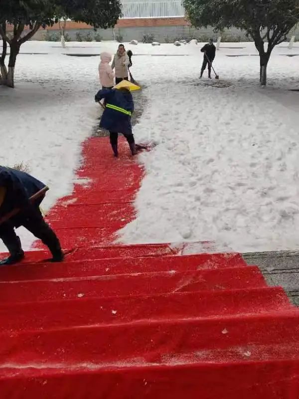 活动现场,教师们顶风冒雪、不畏严寒,用铁锹、扫帚、簸箕等工具对积雪路面开展扫雪除冰行动。行动是最好的融雪剂。大家分工明确、齐心协力,对学校大门口、教学楼台阶、食堂出入口和校园主干道等重点区域的积雪进行清理,为师生清理出一条饱含温情的安全之路。