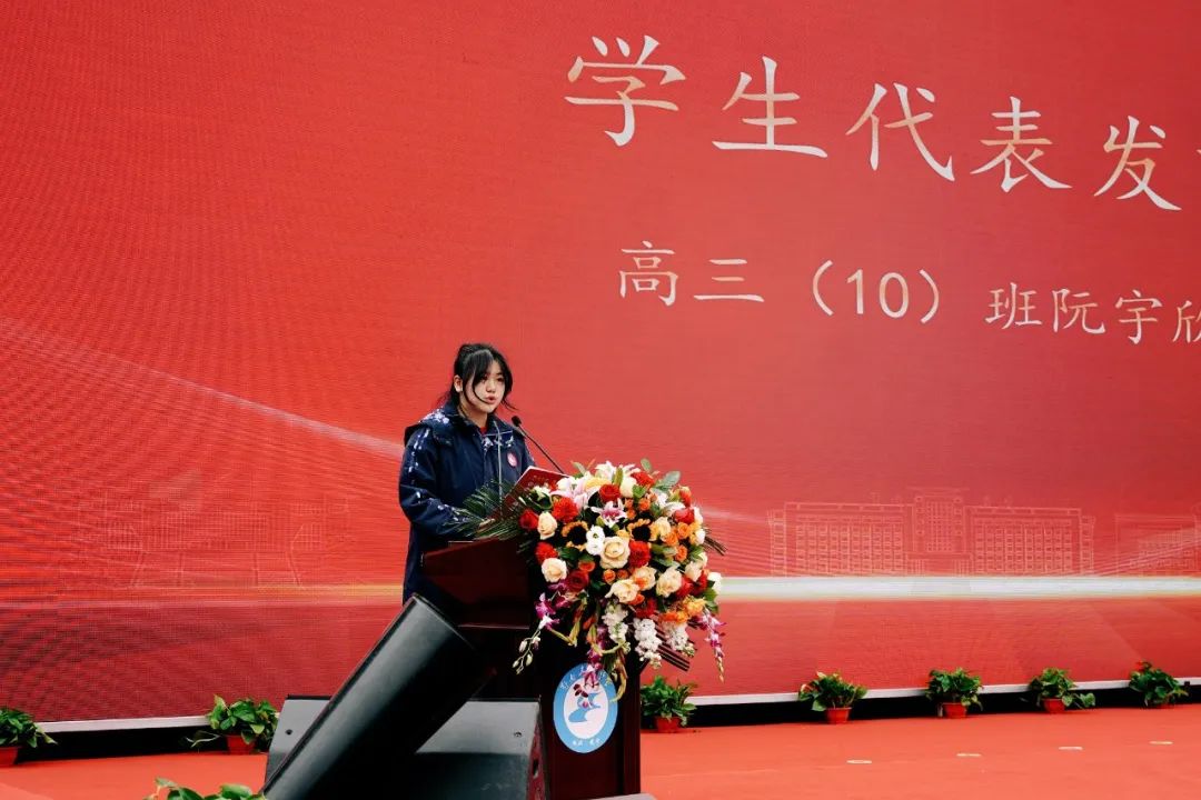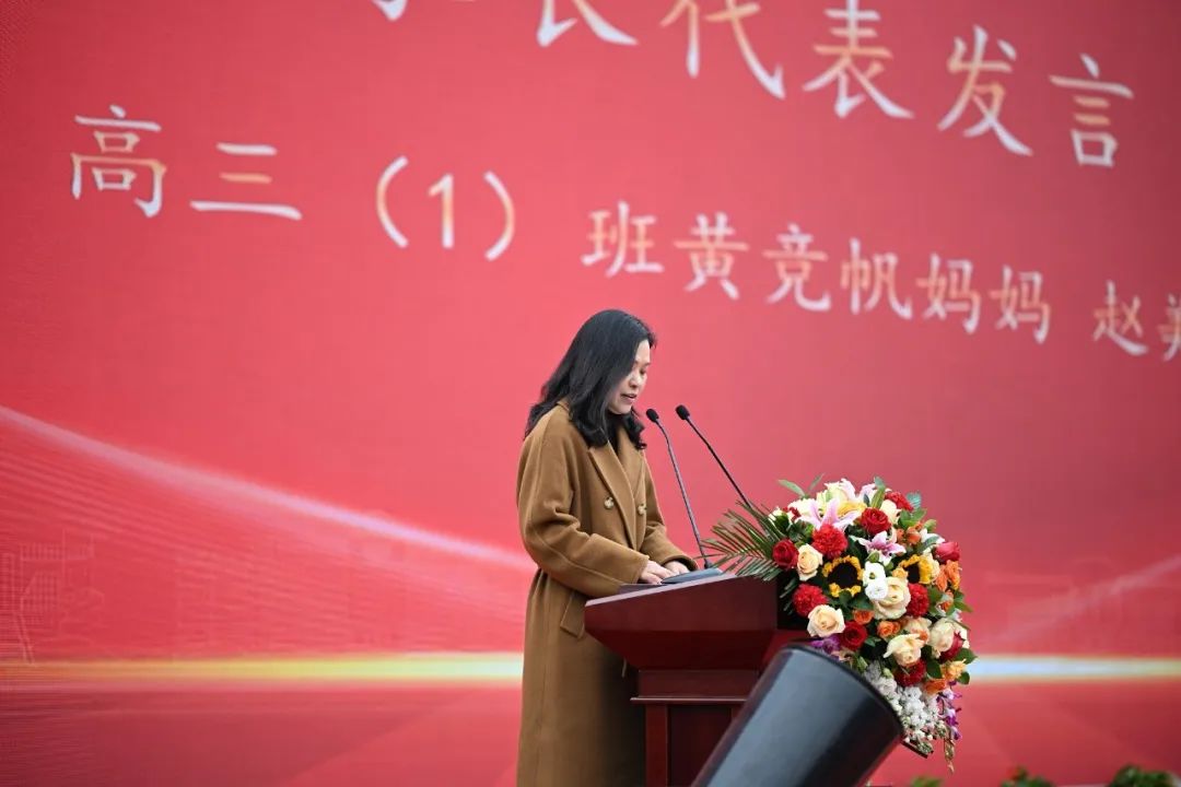 高三(1)班黄竞帆的妈妈赵美英作为家长代表发言,句句感恩,表达了对学校、老师的信任;声声承诺,传递出作为父母对孩子的殷切希望和真切祝福。她为高三学子送上一份远征的“行囊”,青年当“小德川流,大德敦化”,当“删繁就简,领异标新”,要“有所为”,更要“有所不为”。