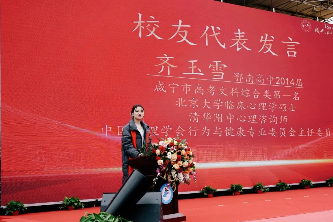 大家好,我是2014届毕业生齐玉雪,很荣幸今天可以作为校友代表参加2024级成人礼活动。距离我高中毕业已经过去了十年,站在这里,我感慨良多。抬头望去,我好像能透过时光,看到那个高考前一天,搬着板凳坐在学校的小喷泉旁,一边晒太阳,一边背书的自己。