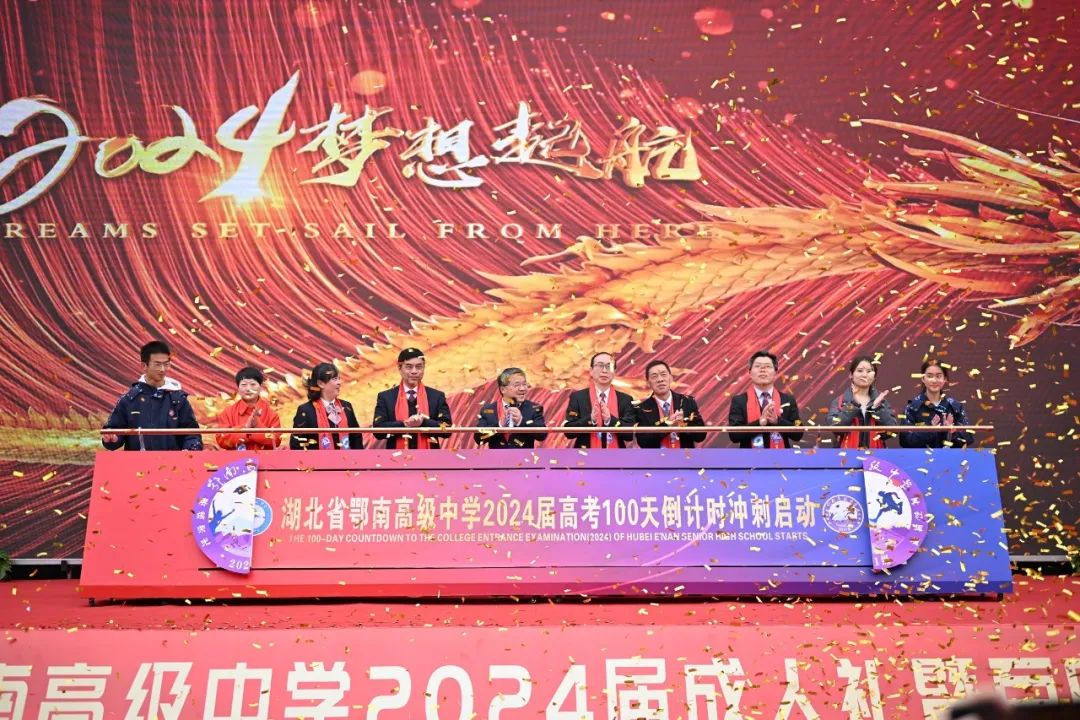 校长袁慎彬与校领导阮长德、潘世南、李志、向阳红、年级主任吕骥、家委会会长邓明、校友代表齐玉雪、学生代表龙铮、程茵一起宣布鄂南高中2024 届高考百日冲刺启动。这也象征着全校上下一心,齐心协力迎接高考的挑战。