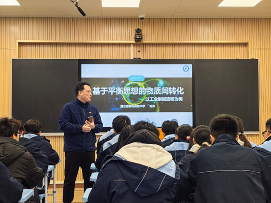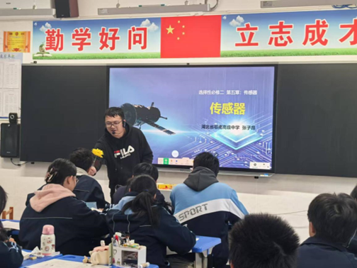 送教活动中,知联会和名师工作室老师分别为通城三中带来物理、化学示范课。其中,物理学科由知联会张子昂老师主讲,化学由刘涛老师主讲。他们准备充分,教学理念先进、教学手段科学、教学方法高效,起到了良好的示范引领效果。张子昂讲授《传感器》。他以“枯叶变绿”为悬念情境,引入课题,一下子就激起了听课师生的兴趣。以三个“魔盒”为主线,讲解了干簧管、光传感器、热敏电阻和力传感器的相关知识。课堂有情境,有探究,有动手,有动脑。最后的作业也有特点,用传感器解决学生学习中的问题,比如自习讲话问题如何提醒、上课睡觉如何警告、黑板反光强烈如何应对。