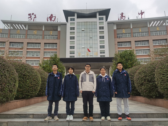 余子健同学、何竹雨同学、生物教练孙栋(中)、杨涛诚同学、杨明同学
