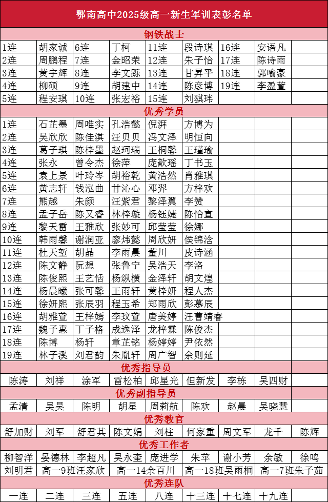 附:鄂南高中2025年高一新生军训表彰名单
