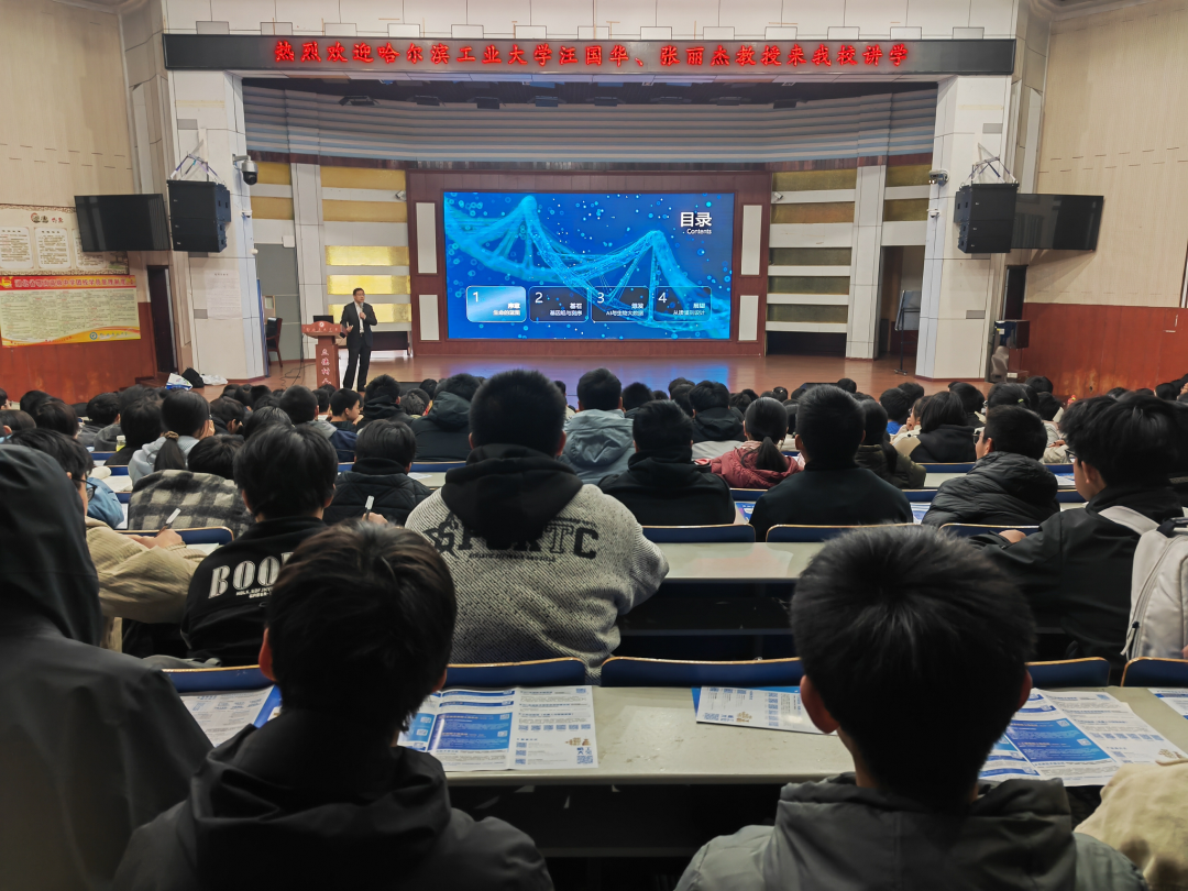 汪国华教授以《从“基因代码”到“生命算法”——我们能用AI设计生命吗?》为题,从生命的蓝图、基因组与测序、AI与生物大数据、从读懂到设计四个维度,系统介绍了基因技术与人工智能在生命科学领域的前沿应用。他以人类基因组计划为起点,讲解科学家如何读取生命“天书”;通过AlphaFold等案例,展示AI如何预测蛋白质结构;从生物大模型技术,展望未来“设计生命”的可能。他还介绍了哈工大在生物信息学领域的最新研究成果,以及计算机科学与生命科学交叉融合如何推动精准医疗、药物研发等领域的突破。深入浅出的讲解,辅以生动的动画演示和翔实的数据分析,让在场师生感受到生命科学与计算机科学交叉融合的无限魅力。