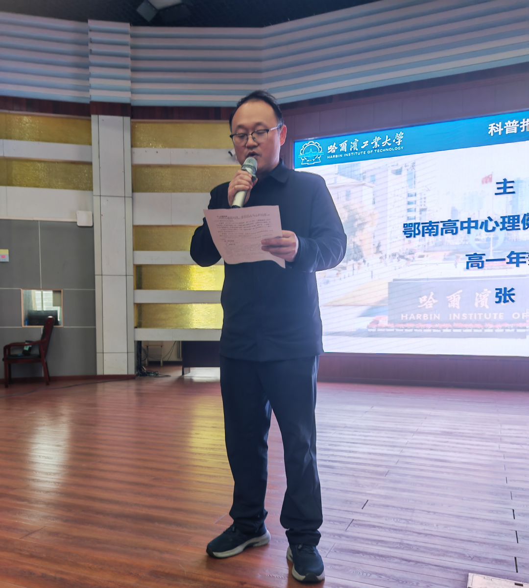 校党委副书记、校长张召华,组织人事处主任潘周全,教务处副主任(主持工作)雷奇华及高一年级物理方向重点班班主任、高二高三年级意向报考哈尔滨工业大学的学生及家长参加活动。讲座由心理健康中心主任、第三党支部书记张宇主持。